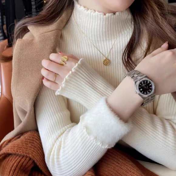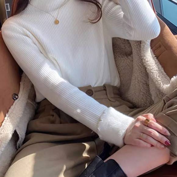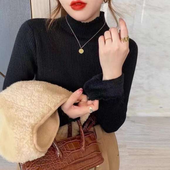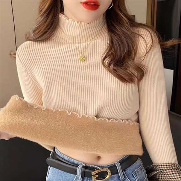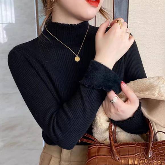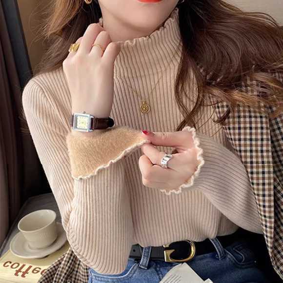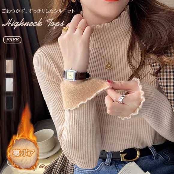 新作 レディース 裏ボア トップス メローフリル リブ 暖かい 着回し ハイネック 保温